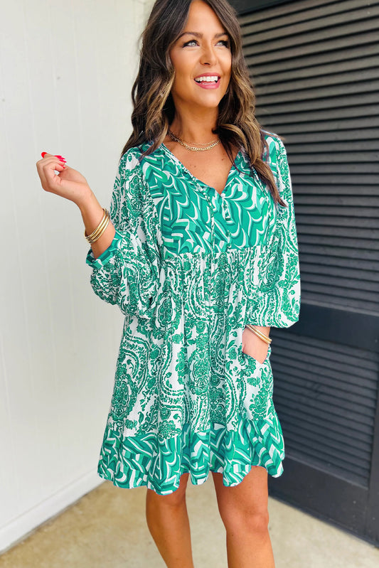 Green Bohemian Print Puff Sleeve Tied V Neck Flared Mini Dress