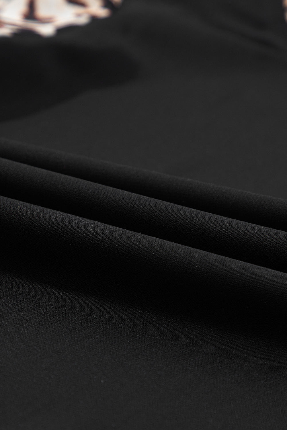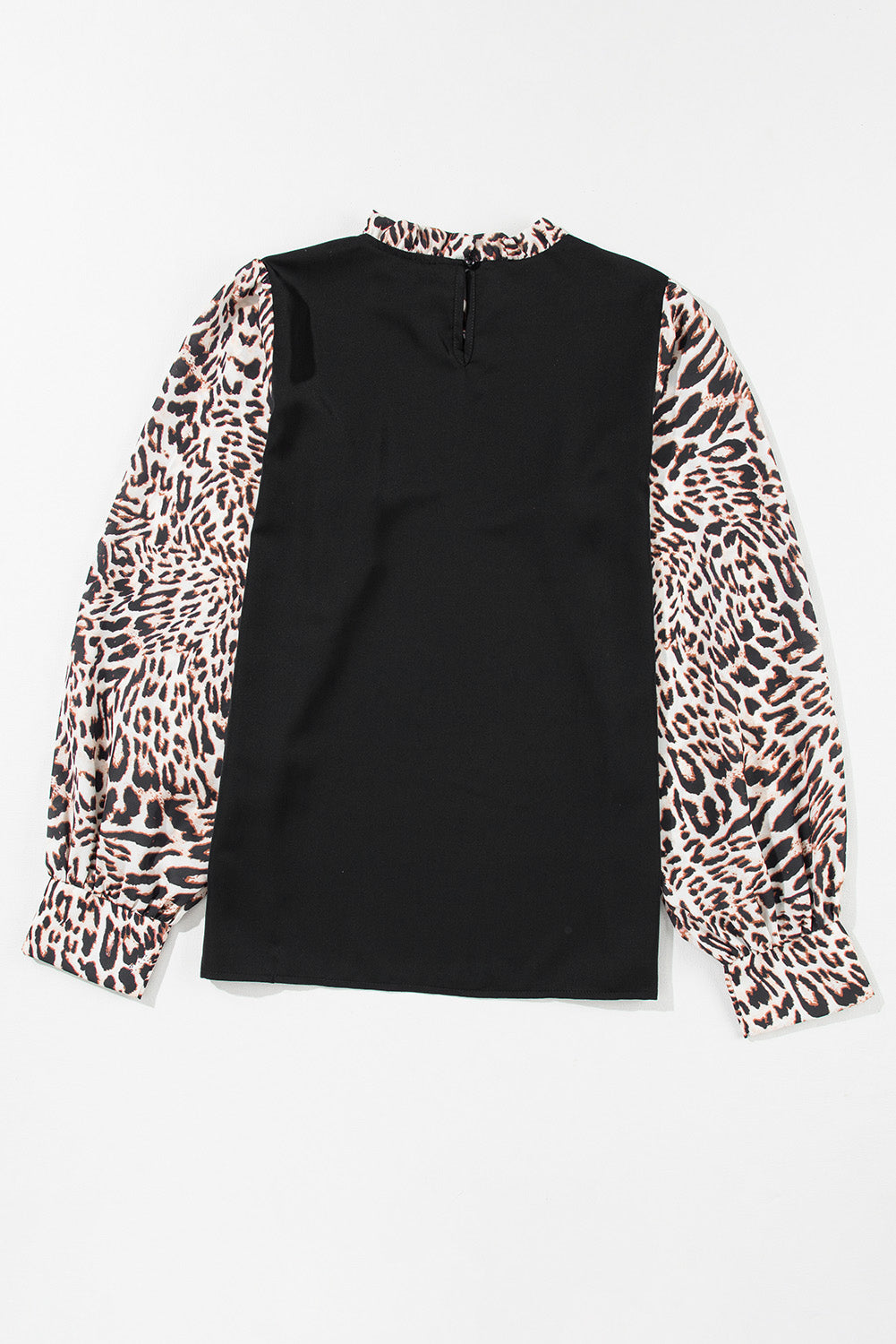Black Contrast Leopard Print Lantern Sleeve Blouse