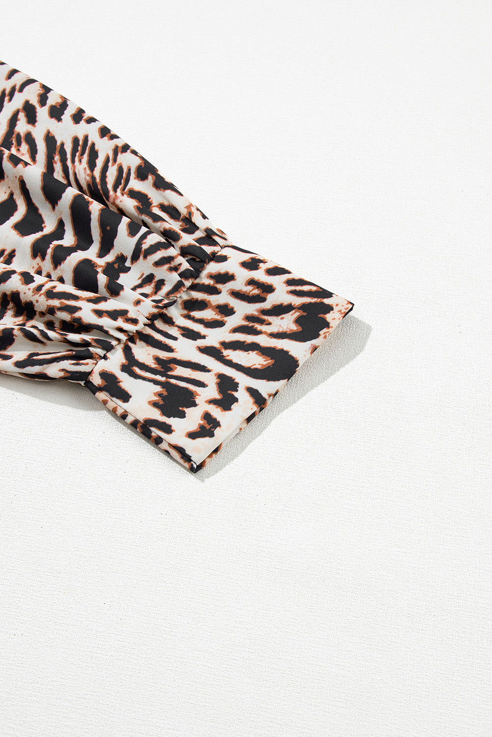 - It features a patchwork silhouette with contrast leopard collar and lantern sleeve